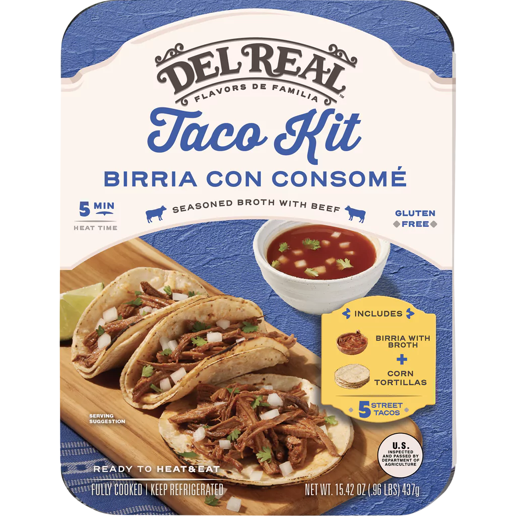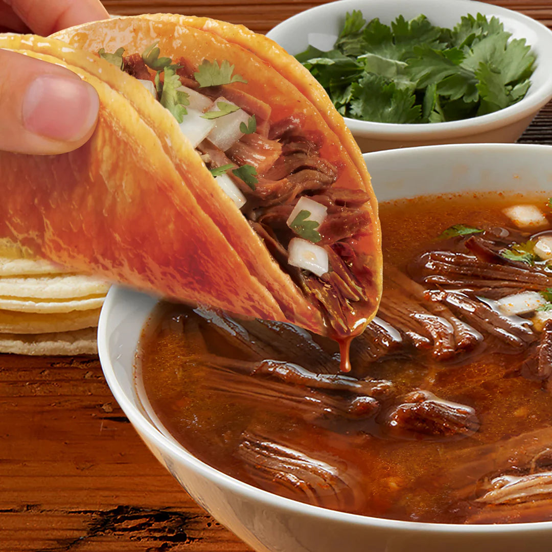 Birria: Beef, Water, Crushed Tomatoes in puree (Tomatoes, Tomato Puree, Salt), Seasoning (Paprika, Chili Pepper, Red Pepper, Dehydrated Garlic, Salt, Spices), Apple Cider Vinegar, Salt, Onion. Tortilla: White Corn Masa Flour Treated with Lime, Water, Contains 2% of Less of Guar Gum, Cellulose Gum, Enzymes, and Propionic, Benzoic Acid, Sorbic Acid, Fumaric acid and Phosphoric Acid (to preserve freshness).