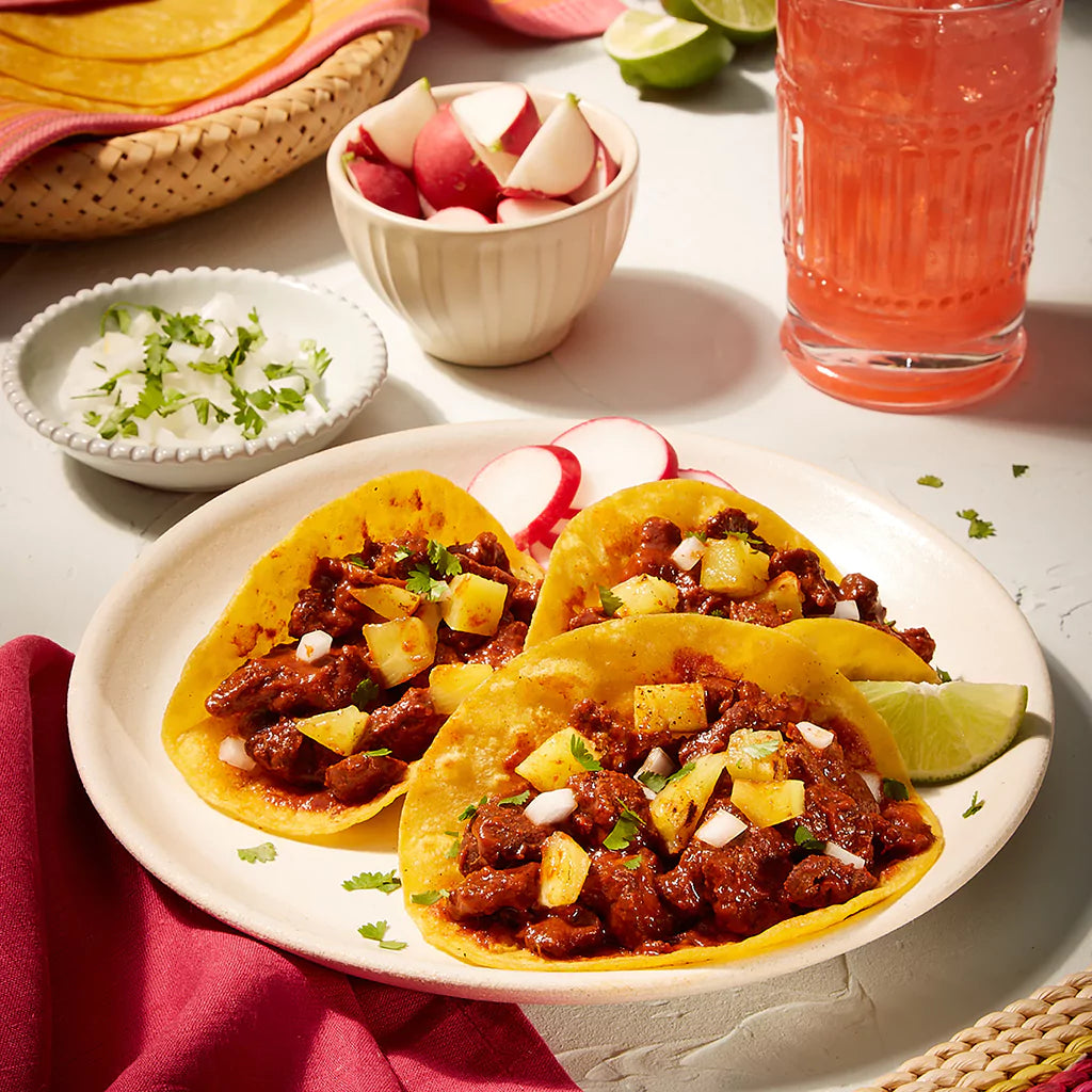 Marinated Pork [Pork, Adobo (Water, Seasoning (Paprika, Chili Pepper, Red Pepper, Dehydrated Garlic, Salt, Spices), Apple Cider Vinegar, Salt)], Onion, Lard. *After cooking, contains up to 10% of solution.